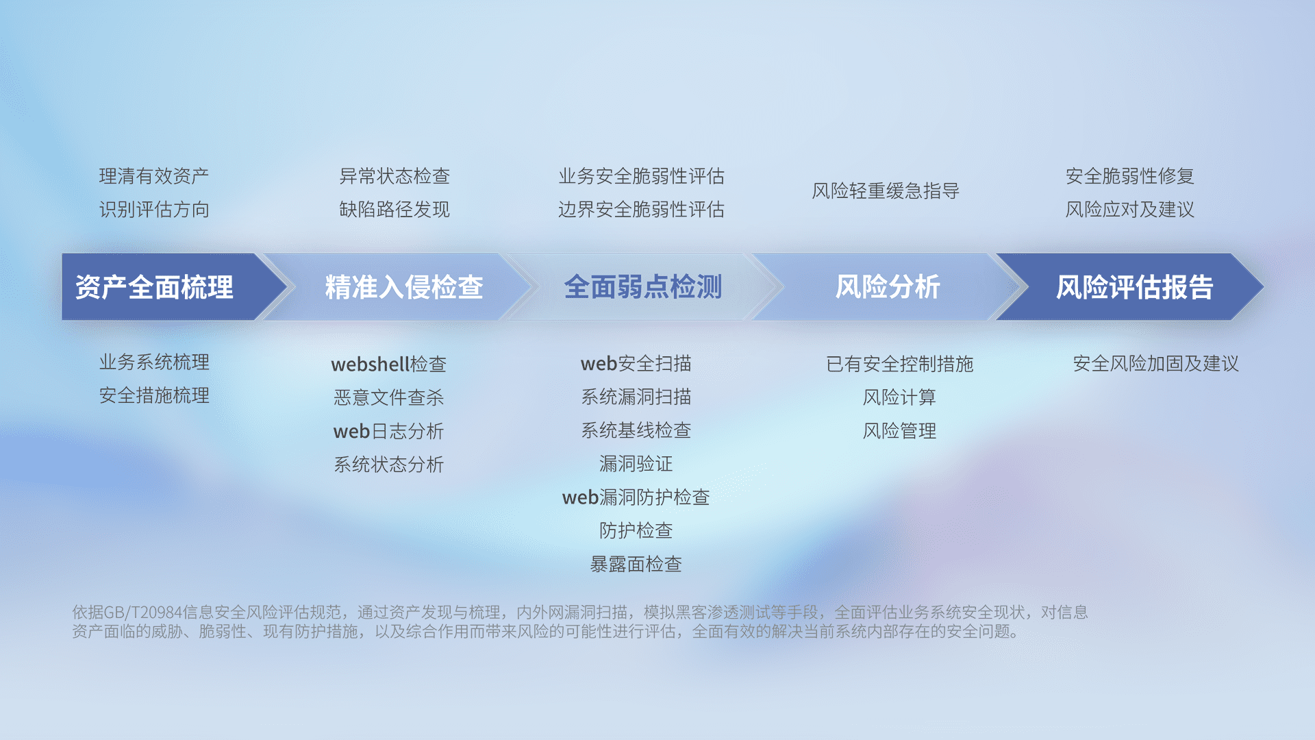 针对客户行业特性,,,以专业的安全服务+多厂商联合解决方案提供专属的一站式安全管理服务,,,帮助客户全面感知网络空间威胁,,,基于识别、、、、检测、、、、分析、、防护、、监测、、、、响应的服务理论模型,,,从方案咨询、、、、集成交付、、、评估验证、、优化加固、、、、运维运营,,致力于为客户提供完整的闭环管理式安全服务。。以实战经验为客户打造高抵御风险的安全体系,,,帮助客户发现威胁、、、、对抗威胁、、、处置威胁,,不断积累安全对抗能力,,持续保障数字化安全。。